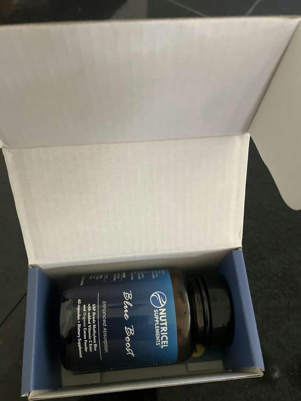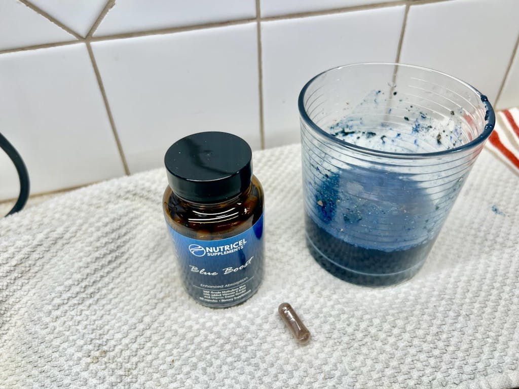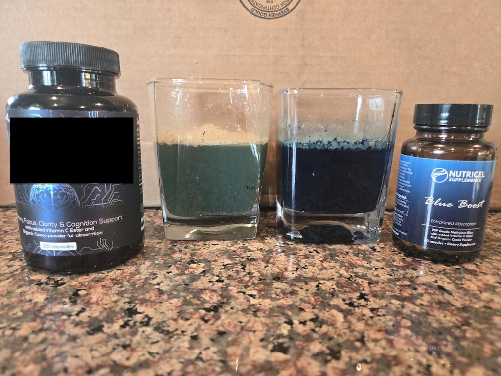 This product is honest and does in fact actually contain methylene blue.I have tried MANY brands on Amazon and this is the only one I have had success with.Nutricel Blue Boost is on the right, 2 capsules.Another inferior brand is on the left. The glass on the left is 4 capsules.