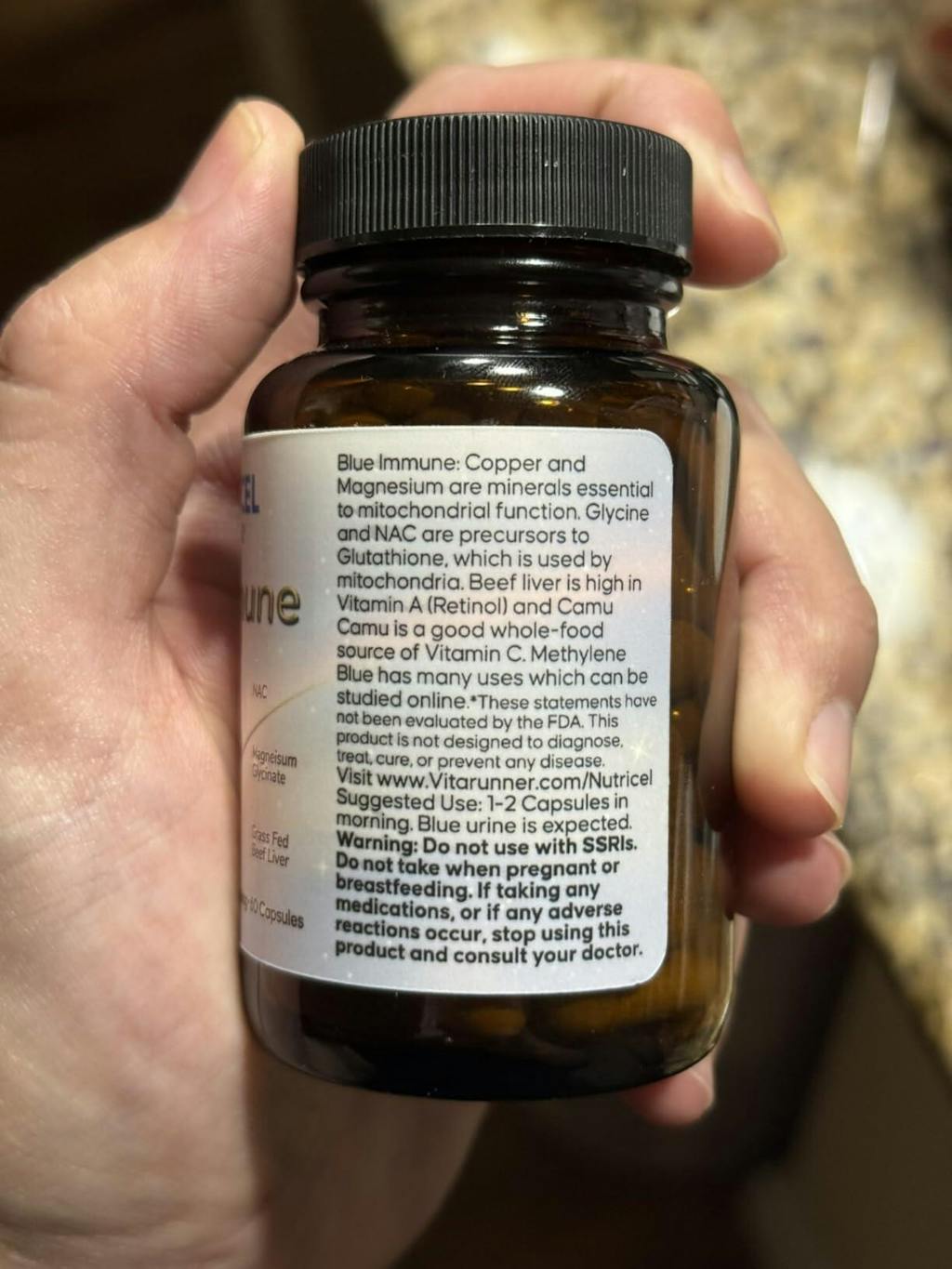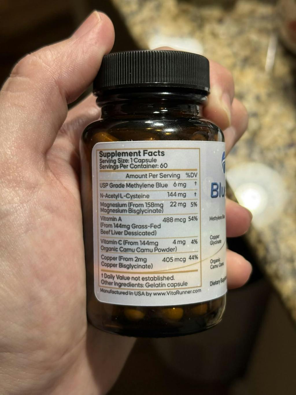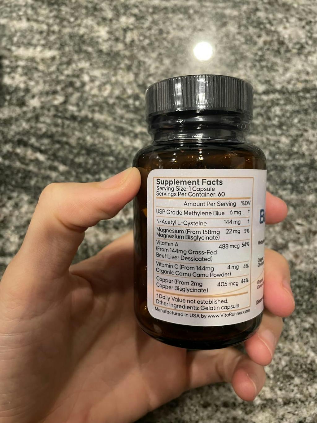 I really like how this supplement gives you the option to take methylene blue without turning your mouth bright blue. Beyond the methylene blue, they’ve also included powerhouse ingredients like beef liver and critical minerals. The serving size is only one capsule - it must be powerful because I feel awesome (and definitely more focused) after consistently taking this. It’s made in an FDA registered, GMP certified facility and is lab tested. The quality and ingredients alone have blown me away. Highly recommend!
