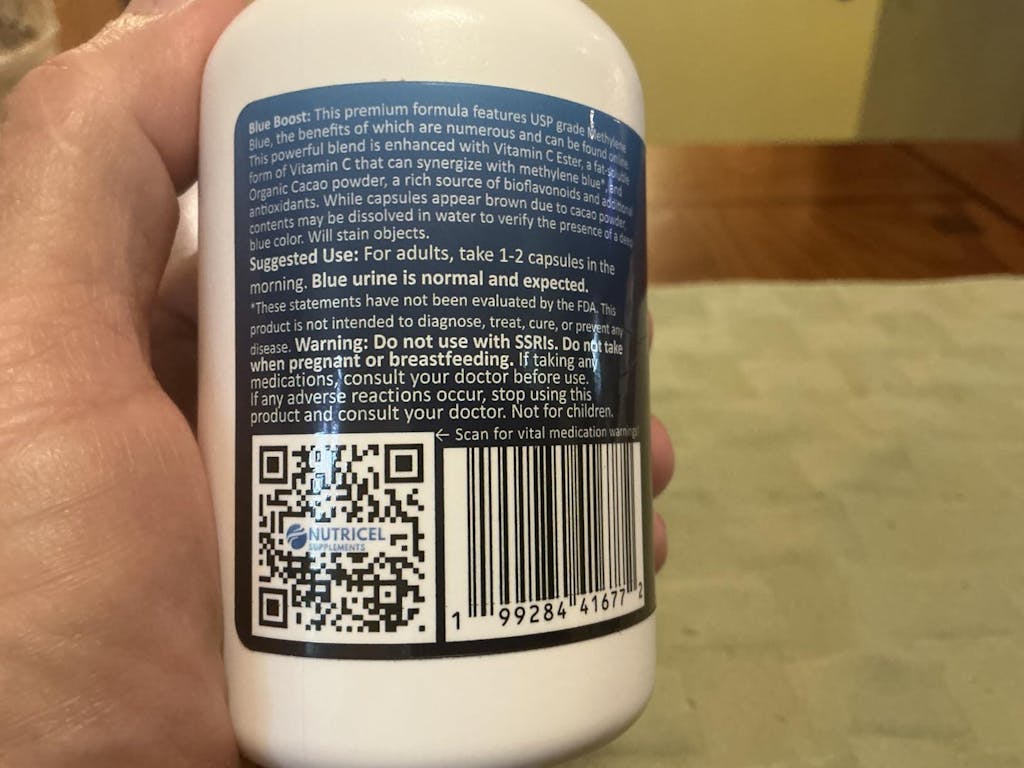 Short review:This is the best formulation of methylene blue I have found. This supplement meets my criteria of third party testing, high quality, and email address listed on the label. This brand also has a compelling synergistic list of ingredients.Detailed review:When two friends suggested that I take methylene blue to treat medical challenges I was facing, I began a deep dive into whether it would help me. I had seen Dr. Mercola, who is known throughout the world, endorse its use years ago. Because of some medical issues I face such as exposure to toxic substances during service in the Vietnam war, I have researched natural ways to bring health to me. This supplement can have a very advantageous affect on one’s health. This brand is very upfront that the use of this supplement is not for everyone! For instance, if you are a caffeinated coffee drinker, you might research. Nutricel is very open with the results of its third party testing. There is a QR code on the label that you can scan to see the results. I posted a picture of the label. When I scanned it, I saw a very comprehensive analysis last done about a year ago. Using a mass spectrometry machine is very accurate. Yes there is lead and other heavy metals listed, but they appear to be in similar findings as to if a person would eat tuna or other sea fish, so it passes my personal concerns. The levels may come from having Cocoa in with the ingredients. Some medicinal plants used in supplements commonly leach heavy metals out of the soil. In my search, I wanted a formula such as this that was pharmaceutical grade. I already take Cocoavia (cocoa supplement) from Amazon, so I was pleased that this supplement had cocoa powder, known for health benefits. I do not want to list why I take this supplement for concern that this review may be rejected. Let it suffice that if you are up in years like me, there are specific reasons why I choose this particular brand of supplement.When I first started taking just one capsule in the morning, my head started having a dull headache. When a person starts to detox to get rid of toxins, this is a common experience. I paused taking this and then resumed and began doing better. I later discovered that there are natural supplements found to help sleep issues and treat other medical issues that can interact with methylene blue. I choose to use this supplement to get rid of toxins I will not name and endure a few days of a dull headache. Yes, as I said, this supplement is notfor everyone’s liking. I prefer using a supplement rather than the liquid form of delivery, easier. And yes, this did turn my pee green or blue, but at the end of the day, it turned a normal color.All said, I can easily recommend Nutricel methylene blue to those who would benefit from its use. Buying this quantity of 120 capsules is more economical.