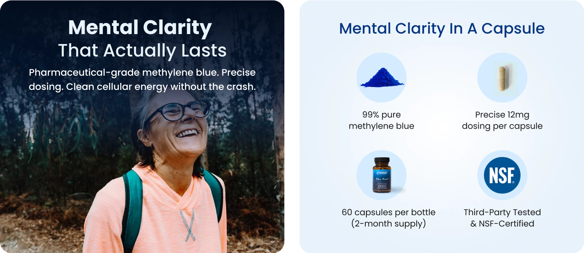 Methylene blue functions as an electron carrier in your mitochondria's electron transport chain, optimizing ATP (cellular energy) production. This process reduces oxidative stress while increasing the energy available to brain cells.