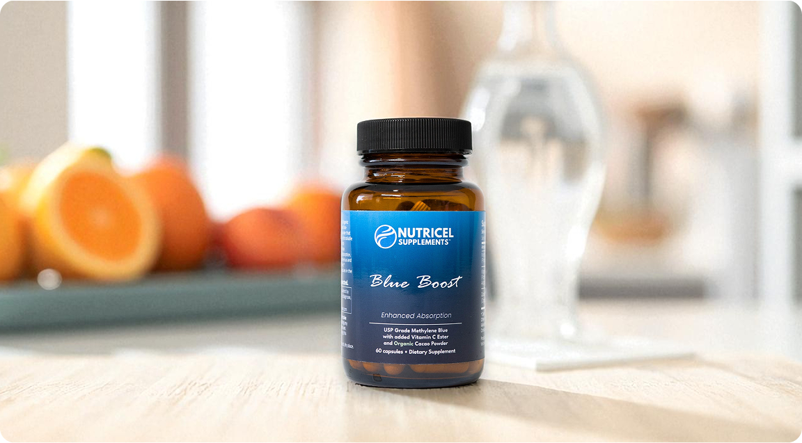 Blue Boost is a pharmaceutical-grade methylene blue formula enhanced with antioxidant-rich cacao and Vitamin C Ester. It supports clean cellular energy, mental clarity, and mitochondrial health without the mess of liquid dyes.