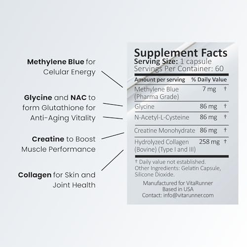 - 7mg Methylene Blue (USP Reference Compliant): A vivid blue compound first synthesized in 1876 and recognized for its unique color and long history of study. 86Mg Glycine: A naturally occurring amino acid found in protein-rich foods and produced by the body. 86mg N-Acetyl Cysteine (NAC): A stable form of cysteine, widely used in nutrition as an amino acid source. 258mg Collagen (Bovine, Type I & III): A structural protein naturally present in skin, joints, and connective tissues. 86mg Creatine Monohydrate: A nutrient found in foods and naturally present in muscle tissue.